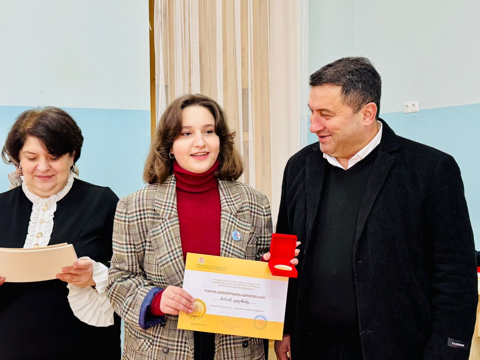 მუნიციპალიტეტის მერმა დავით ბახტაძემ, სამტრედიის საგანმანათლებლო რესურსცენტრის უფროსთან თინათინ ხარძიანთან, საკრებულოს თავმჯდომარის მოვალეობის შემსრულებელთან, ვაჟა სტურუასთან და ადგილობრივი თვითმმართველობის სხვა წარმომადგენლებთან ერთად ოქროსა და ვერცხლის მედალოსნები დააჯილდოვა.